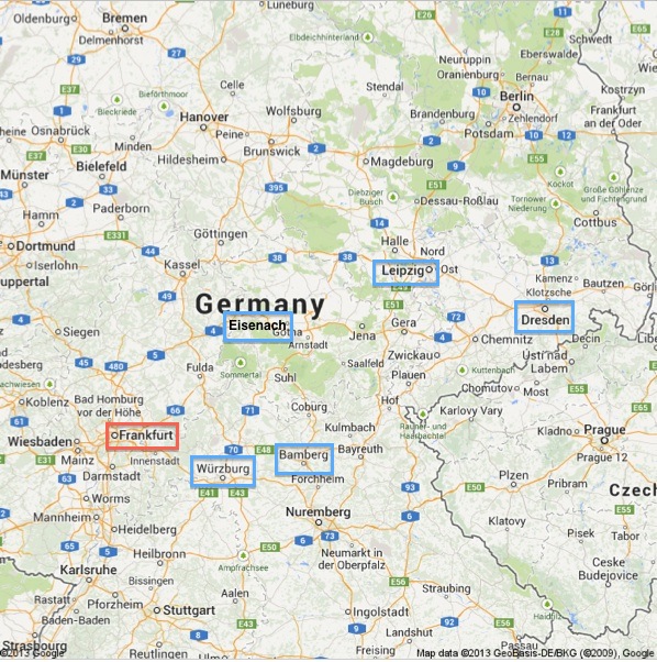 青い枠で囲んだ、アイゼナハ、ライプツィヒ、ドレスデン、バンベルク、ヴュルツブルクの5つの街に宿泊しました。