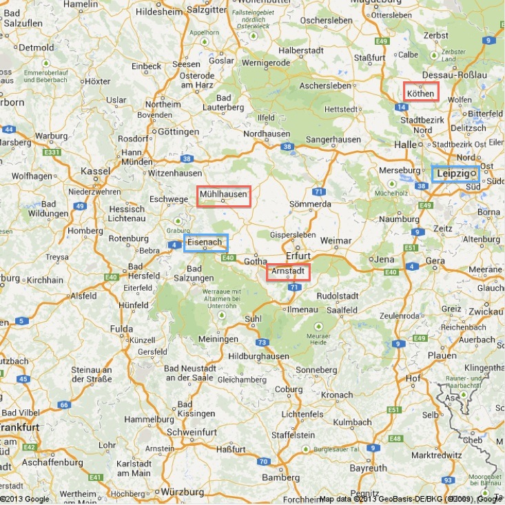 赤い枠で囲んだ、アルンシュタット、ミュールハウゼン、ケーテンが、バッハが若い頃に住んだり仕事をしたり活躍した街です。